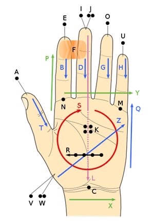 In de auto naar de Thermen in Soesterberg halen we gauw het LORM tastalfabet nog even op. Elke letter van dit alfabet wordt tactiel op een hand aangegeven door middel van tikken of lijnen trekken. De klinkers zijn bijvoorbeeld een tikje op de top van elke vinger; de A op de duim, de E op de wijsvinger, enzovoort. De B is een lijn naar beneden op de wijsvinger, de C een tikje op de pols. Zo heeft elke letter een eigen tikje of lijn. Je moet het even uit je hoofd leren. Maar als je het eenmaal kent, kun je op deze manier snel woorden en zinnen maken zonder dat je hoeft te horen of te zien.